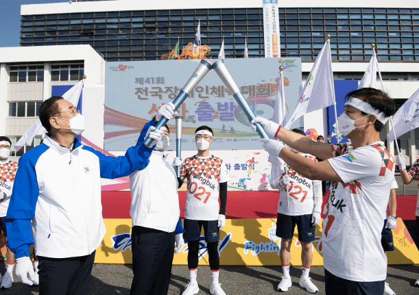 구미시는 20일 오전 9시 30분 시청 광장에서 장세용 구미시장, 김재상 구미시의회 의장 등 40여명이 참석한 가운데 제41회 전국장애인체육대회의 성공적인 개최를 기원하며 출발식과 함께 성화봉송을 진행했다.
