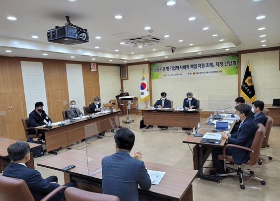 대구광역시의회의 의원연구단체인 자치정책연구회는 20일 오후 2시 공공기관 및 기업의 사회적 책임 활동을 제도적으로 지원하고자 관련 조례에 담을 사항을 논의하는 ‘조례 제정 간담회’를 시의회 3층 회의실에서 개최했다.