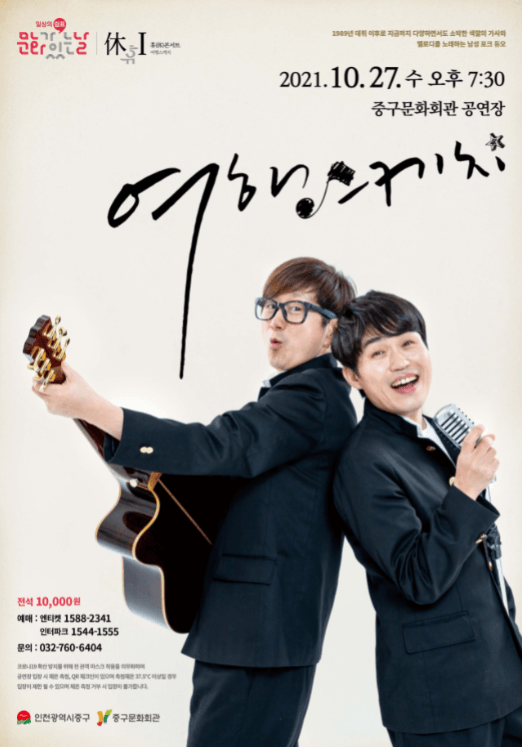 중구문화회관은 문화가 있는 날을 맞아 2021년 하반기 시즌기획으로 휴(休)콘서트 공연을 개최한다. 10월 27일『여행스케치』, 11월 24일『변진섭』, 12월 29일『몽니』순으로 각각 개성있는 사운드를 팬들에게 선보일 예정이다.