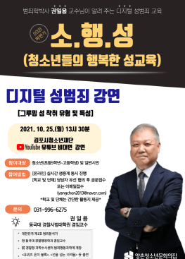(재)김포시청소년재단 양촌청소년문화의집은 김포시 관내 청소년 및 시민들을 대상으로 10월 25일 범죄학 박사 권일용 교수와 함께 하는 비대면 청소년 특강 ‘소.행.성(청소년들의 행복한 성교육)을 운영한다.