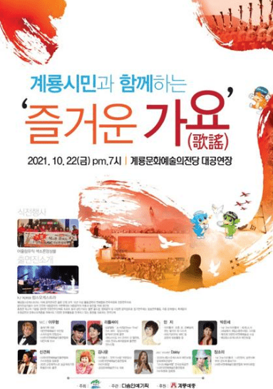 계룡시는 오는 22일 저녁 7시 계룡문화예술의전당 대공연장에서 ‘계룡시민과 함께하는 즐거운 가요’를 공연한다고 전했다.