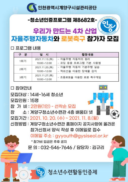 인천광역시 계양구시설관리공단 청소년수련관에서는 청소년수련활동인증프로그램인『우리가 만드는 4차 산업, 자율주행자동차와 로봇축구』 참여자를 다음 달 8일까지 모집한다.