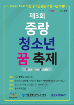 중랑구가 오는 23일 12시부터 용마폭포공원에서 제3회 중랑청소년 꿈축제를 온라인 비대면으로 개최한다.