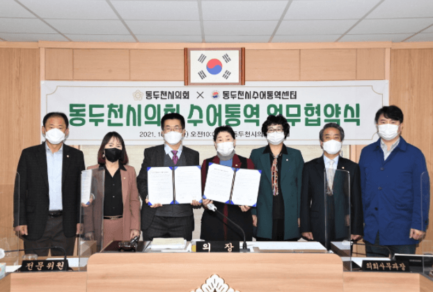 동두천시의회는 19일 동두천시의회에서 동두천시수어통역센터와 수어통역 업무협약을 체결했다고 밝혔다. 이날 협약식에는 동두천시의회 정문영 의장, 박인범 부의장, 김승호 의원, 정계숙 의원, 김운호 의원, 최금숙 의원과 동두천시수어통역센터 이안식 센터장 등이 참석했다.