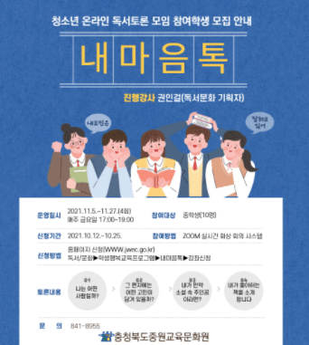 충청북도중원교육문화원은 독서를 통해 서로의 고민거리를 나눌 수 있는 프로그램의 참가 신청을 받고 있다.