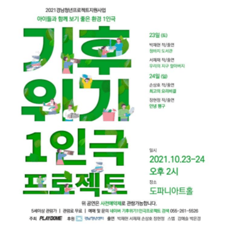 경상남도는 다양한 창작 활동을 펼치고 있는 플레이돔(palydome)이 오는 10월 23일부터 24일까지 오후 2시부터 창원 명서동 도파니 아트홀에서 기후위기를 주제로 한 공연을 무대에 선보인다고 밝혔다.