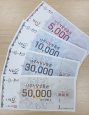 나주사랑상품권은 지류·카드 구분 없이 개인별 월 50만원 한도 내 농협, 우체국 등 금융기관 55개소에서 신청 당일 구매·발급받을 수 있다.
