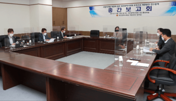 대전시의회 지방자치 연구회는 19일 시의회 중회의실에서‘지방자치법 개정에 따른 대전광역시의회 조직구조 개편방안 연구용역 중간보고회’를 개최했다.