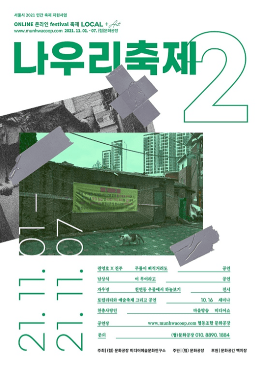 협동조합 문화공장에서 주최·주관하고 서대문구가 후원하는 ‘나우리축제2’가 11월 1일부터 7일까지 협동조합 문화공장 홈페이지에서 열린다.