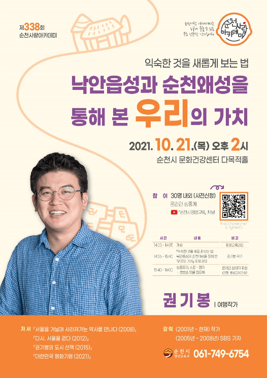 순천시는 오는 21일 오후 2시 문화건강센터 다목적홀에서 역사를 통해 바라 본 리더십과 공동체주의에 관한 특강을 개최한다.