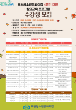 포천시 청소년수련시설(포천시청소년교육문화센터 및 포천청소년문화의집)에서는 코로나19 장기화에 따른 체험활동 욕구 해소를 위해 관내 청소년들을 대상으로 꿈키움·창의교육 프로그램을 운영한다.