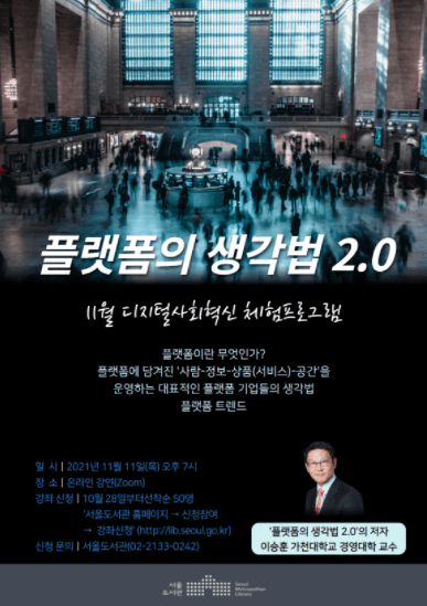 서울도서관에서는 ‘플랫폼’을 주제로 11월 11일 오후 7시에 ‘플랫폼의 생각법 2.0’을 주제로 저자인 이승훈 교수를 (가천대학교 교수, 네모파트너즈 대표 파트너) 초빙하여 온라인 강연을 개최한다. ‘플랫폼’이라는 용어의 개념 및 확장이 경제적(비즈니스) 관점에서 파급효과, 가치창출 등을 살펴보는 시간이다.