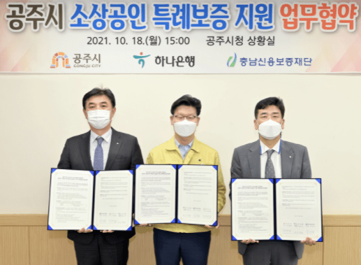 공주시는 지난 18일 시청 상황실에서 코로나19 장기화로 인한 지역 소상공인의 위기 극복을 지원하기 위해 하나은행, 충남신용보증재단과 ‘소상공인 특례보증 업무협약’을 체결했다.