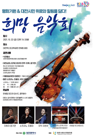 대전시는 오는 22일 오후 7시 30분 대전엑스포과학공원 한빛탑광장에서 시민 위로와 평화 기원을 담은 ‘희망 음악회’를 개최한다고 18일 밝혔다.