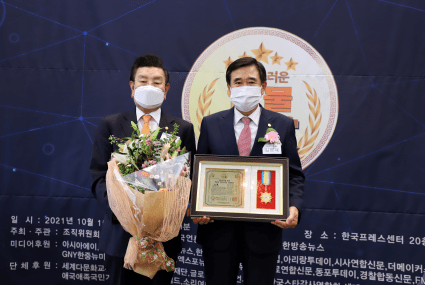 용산구의회 김정재 의장은 지난 10월 15일 오후 2시 30분 한국프레스센터에서 한국언론연합회 주관으로 개최된 ‘제7회 2021자랑스러운 인물 대상 시상식’에 참석하여 ‘올해의 의정혁신 부문 대상’을 수상했다.