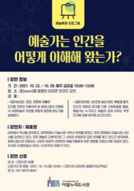 고양시 아람누리도서관이 예술특화프로그램 '예술가는 인간을 어떻게 이해해 왔는가?'을 온라인 운영한다. 이 강연에서는 서양미술사를 ‘휴머니즘’이라는 키워드를 통해 생각해본다.