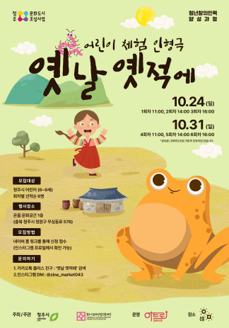 24일부터는 체험형 프로젝트들이 시민을 만난다. 24일(일)과 31일(일) 각각 3차례씩 총 6회 공연하는 ▷옛날 옛적에는 청주의 설화 지네장터를 바탕으로 한 스토리텔링형 어린이 인형극으로 문화도시 동네기록관 중 하나인 온몸문화공간(청주 청원구 무심동로 576)에서 만나볼 수 있다. 인형극 관람과 체험이 어우러진 프로그램으로 참여자들의 몰입도가 높을 것으로 기대된다. 프로그램 참여 신청은 네이버폼으로 진행되며, 옛날 옛적에 인스타그램(zine_market043) 또는 문화도시청주 홈페이지에서 확인 가능하다.