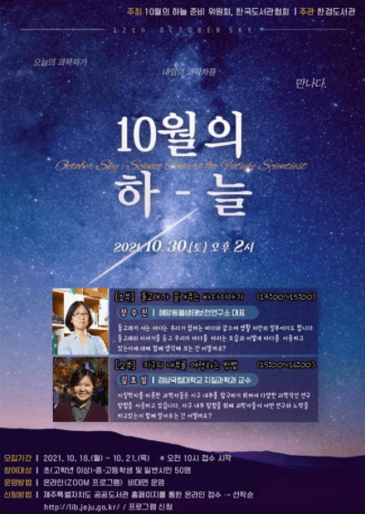 한경도서관에서는 '10월의 하늘' 특별 강연을 오는 10월 30일 오후 2시부터 4시까지 온라인 비대면으로 운영한다고 밝혔다.