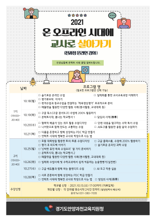 경기도안양과천교육지원청은 10월 18일부터 28일까지 2주간 관내 중등교원을 대상으로 2021 안양과천 교원 역량 강화 연수 “온·오프라인 시대에 교사로 살아가기”를 진행한다.
