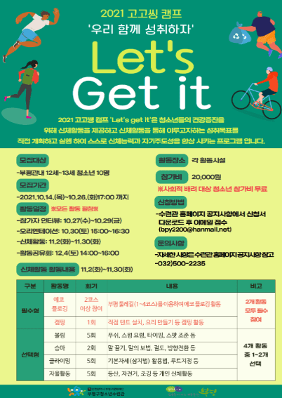 부평구청소년수련관이 청소년의 건강증진활동 2021 고고씽 캠프 ‘Let’s get it’ 참가자를 추가 모집한다.