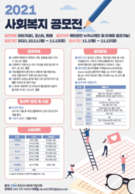 이번 공모전은 옥천군사회복지협의회에서 진행되는 것으로 사회복지에 대한 옥천군민의 다양한 생각을 듣고 군정에 반영하며 사회복지에 대한 이해와 현장의 목소리, 사회복지 참여를 촉진하기 위해 마련되었다.