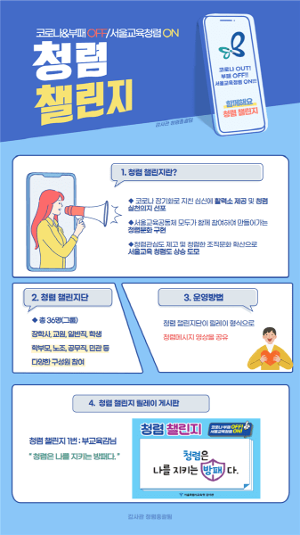 서울특별시교육청은 오는 10월 18일부터 20일 간 청렴 관심도 제고 및 일상에서의 청렴실천 다짐을 위해 청렴 챌린지를 실시한다.‘청렴 챌린지’란 공모를 통해 선정된 36명의 청렴 챌린저가 자신만의 청렴메시지를 영상으로 담아 공유하는 것으로 참가자가 다음 사람을 지명하는 릴레이 형식으로 진행된다.