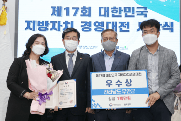 무안군이 ‘제17회 대한민국 지방자치경영대전’에서 일자리분야 우수기관으로 선정되어 행정안전부 장관상을 수상하였다고 밝혔다.