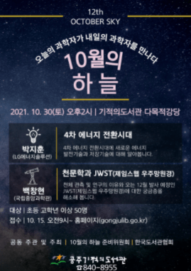 공주시가 10월의 하늘 준비위원회와 한국도서관협회가 주최하는 ‘10월의 하늘’ 과학강연을 오는 30일 기적의도서관에서 진행한다.