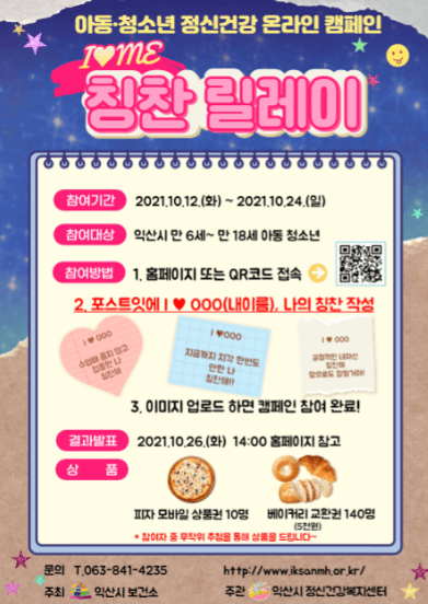 익산시보건소와 익산시정신건강복지센터에서는 익산시 아동‧청소년을 대상으로 이달 24일까지 ‘I♥ME 칭찬릴레이’ 온라인 캠페인을 실시한다.