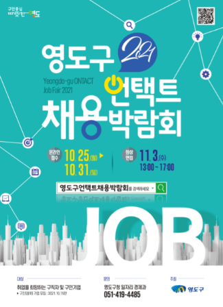 부산시 영도구는 코로나19로 취업에 어려움을 겪고 있는 구직자와 구인기업을 지원하기 위하여 오는 10월 25일부터 31일까지 7일 동안 온라인으로 '2021 영도구 언택트 채용박람회'를 개최한다.