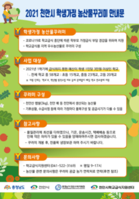 천안시와 천안교육지원청은 코로나19로 학교급식이 중단됨에 따라 가정급식에 대한 학부모 부담 경감과 학생들의 건강증진, 지역농산물 소비확대를 위해 ‘학생가정 농산물 꾸러미 공급사업’을 추진한다.