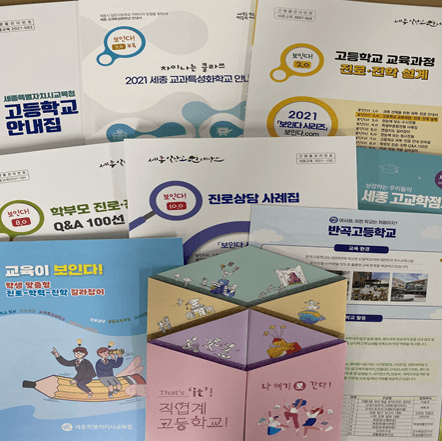 고등학교 안내집에서는 세종시 관내 고등학교의 학교 현황, 주요 특색활동, 학교생활, 학교 교육활동, 교육과정 등의 정보와 고등학교 입학에 관한 평준화 지역 고등학교 배정 방법, 통학권, 학교장 선발교의 입학요강 등의 정보를 접할 수 있다.
