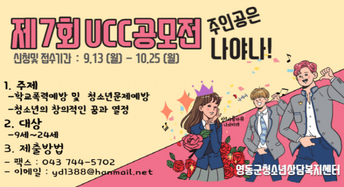 충북 영동군청소년상담복지센터는 올해로 7회째를 맞는 ‘2021년 청소년문제예방 UCC 공모전’을 개최중이라고 밝혔다.