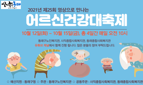 대축제 내용은 동래구노인복지관, 사직ㆍ동래종합사회복지관, 동래시니어클럽 3개 유튜브 채널로 방송된다.