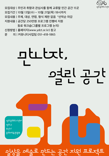 '만나자, 열린 공간'은 △총 15곳의 커뮤니티형 공간을 모집하며, 영도 내 민간 공간 운영자를 대상으로 선착순 모집한다. 자신의 공간에서 모임의 주제와 형식, 대상을 제한하지 않고 자유롭게 운영할 수 있는 프로그램을 구성하여 신청할 수 있다.
