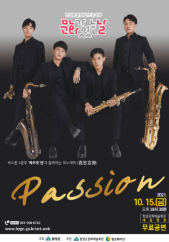 함양군은 깊어가는 10월 ‘문화가 있는 날’행사의 일환으로 10월 15일 오후 6시 30분 함양군문화예술회관 대공연장에서 색소폰 4중주 ‘콰르텟 앤’과 함께하는‘희노애락’ 공연을 선보인다.