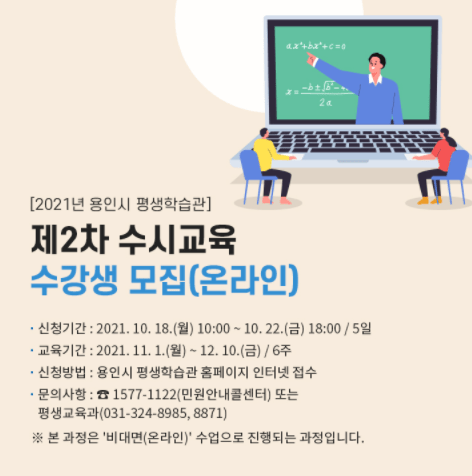 용인시 평생학습관이 오는 18일부터 22일까지 ‘제2차 수시교육’ 수강생을 모집한다.