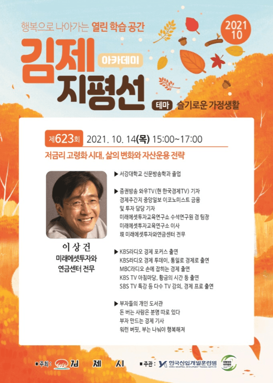 제623회 김제지평선아카데미는 10월 14일 이상건 미래에셋투자와 연금센터 전무를 초청하여 ‘저금리 고령화 시대, 삶의 변화와 자산운용 전략’이라는 주제로 강연을 진행한다.
