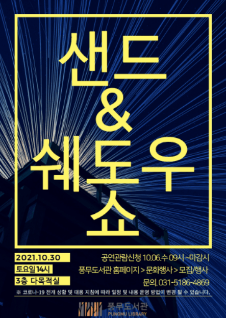 김포시 풍무도서관은 10월 30일 토요일 14시 문화공연 프로그램 「샌드&쉐도우 쇼」를 운영한다.
