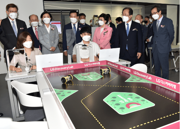 김석준 부산광역시교육감이 5일 오후 2시 부산진구 LG디스커버리랩에서 박형준 부산시장과 신상해 부산시의회의장, 김영환 국립부산과학관장 등이 참석한 가운데 열린 ‘LG디스커버리랩 개관식’에서 축사를 하고 있다.