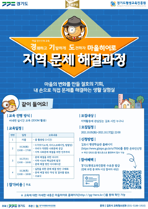 김포시 읍․면․동 평생학습센터는 오는 10월 26일부터 10월 29일까지 총15시간에 걸쳐 지역 활동에 관심 있는 김포시민 대상으로 「마을 민주주의 교육 지역문제해결과정」을 온라인으로 운영한다.