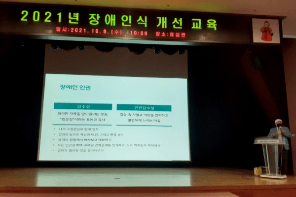 이날 교육은 장애인에 대한 사회적 편견과 차별 제거 및 비장애인과 함께하는 통합사회를 조성하기 위해 마련되었으며, 인천생명의전화 인권교육센터장 이요한 강사를 초빙하여 장애의 전반적 이해, 권리의 이해, 유형별 지원방법 및 인식 변화에 대해 강의를 진행하였다.