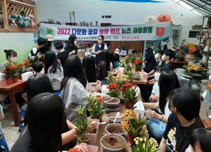 지난 6월 4일, 서일고등학교(교장 이용담) 4H SMT 다문화 가정 학습도우미 봉사활동 동아리의 3학년 정한슬외 20명의 학생들은 서산시 인지면에 위치한 ‘난사랑방’에서 17명의 다문화 가족들과 함께 분경 만들기 체험활동을 실시하였다.