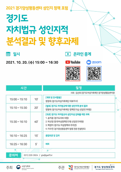 경기도여성가족재단 경기도양성평등센터가 20일 오후 3시 재단 회의실에서 ‘경기도 자치법규 성인지적 분석결과 및 향후과제’를 주제로 성인지 정책포럼을 온라인 개최한다.