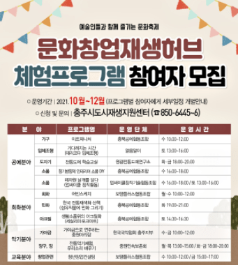충주시가 오는 12월까지 ‘문화창업재생허브 체험프로그램’ 참여자를 모집한다.