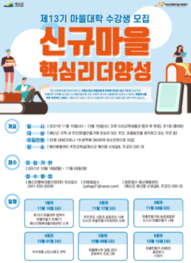 예산군은 예산군행복마을지원센터에서 진행하는 신규마을 핵심 리더 양성교육 과정인 제13기 마을대학 수강생을 오는 11월 9일까지 모집한다.