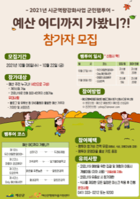 예산군은 관내 마을에서 운영하는 다양한 체험·문화·교육 프로그램 및 예산 곳곳에 숨겨진 아름다운 경관을 주민들에게 알리고 홍보하기 위해 오는 10월 22일까지 군민팸투어 참가자를 모집한다.