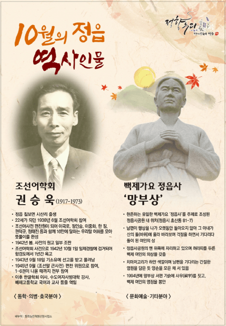 정읍시가 10월의 역사 인물로 조선어학회‘권승욱’ 선생과 백제가요 정읍사 ‘망부상’을 선정했다.