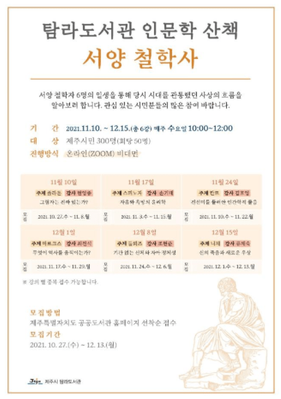 제주시 탐라도서관에서는 고대부터 현대까지 서양 철학의 시대별 흐름을 살펴보는 '서양 철학사' 프로그램을 온라인으로 운영한다고 밝혔다.