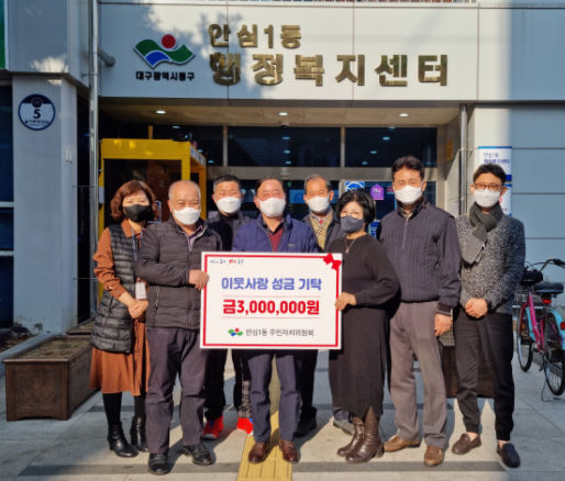 대구 동구 안심1동 주민자치위원회는 지난 23일, 안심1동 행정복지센터를 방문하여 어려운 이웃에게 전달해 달라며 300만원의 성금을 기탁했다.